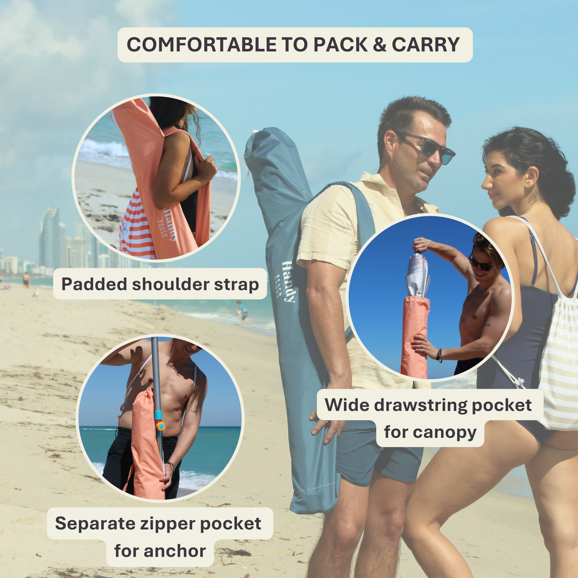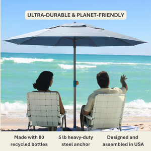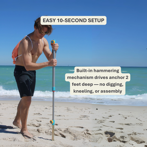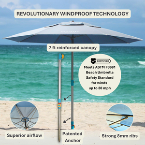 Wind-resistant by design and independently ASTM wind-tested, this beach umbrella and anchor system is built for real coastal conditions. The deep-set sand anchor and reinforced frame keep your shade steady, while the 10-second mess-free setup means more time relaxing—no digging, no sandbags, no stress. The UPF 55+ silver-lined canopy blocks UV rays and reflects heat, so your shade feels safer and cooler all day. Crafted with durable hardware and a recycled-fabric 7-foot canopy, it’s built to last season after season.