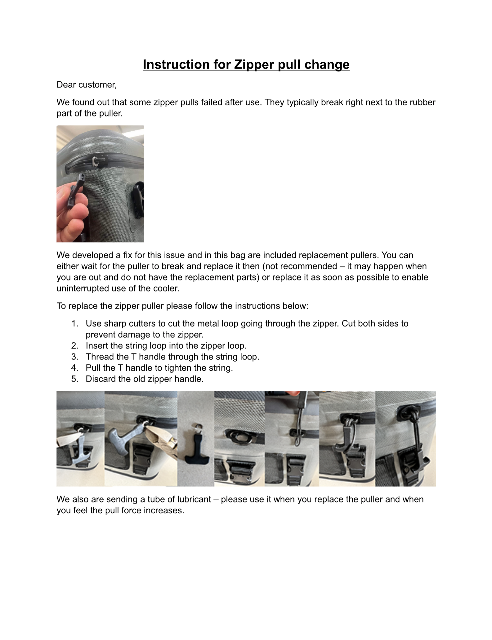 When you are done replacing the T handle we highly reccomend to use the LubeTube to lubricate the repaired zipper for smooth and long lasting operation.